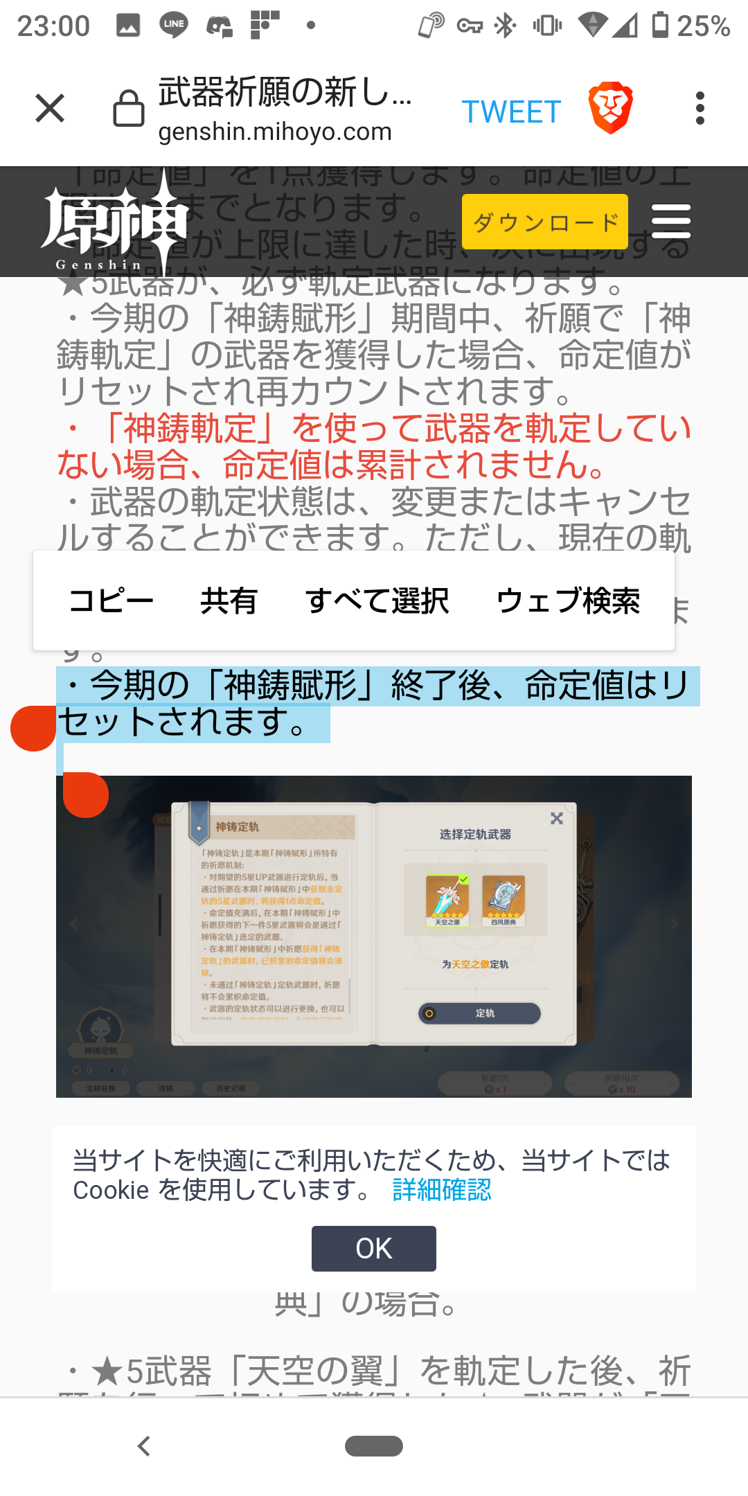 例では「★5武器「天空の翼」を軌定した後、祈願で一回目と二回目で獲得した★5武器が全て「四風原典」であった場合、命定値を2点獲得」
