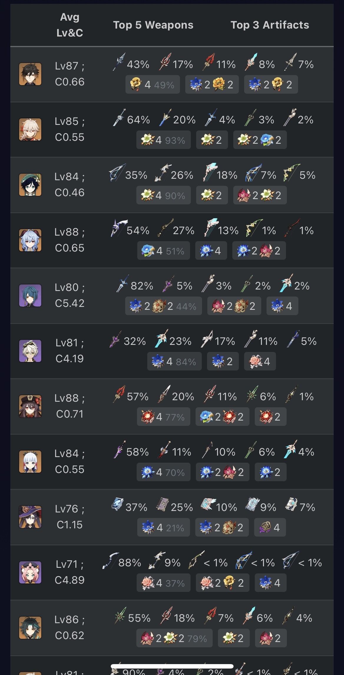 綾華の霧切58%甘雨のアモス54%胡桃の護摩57%魈の和璞55%