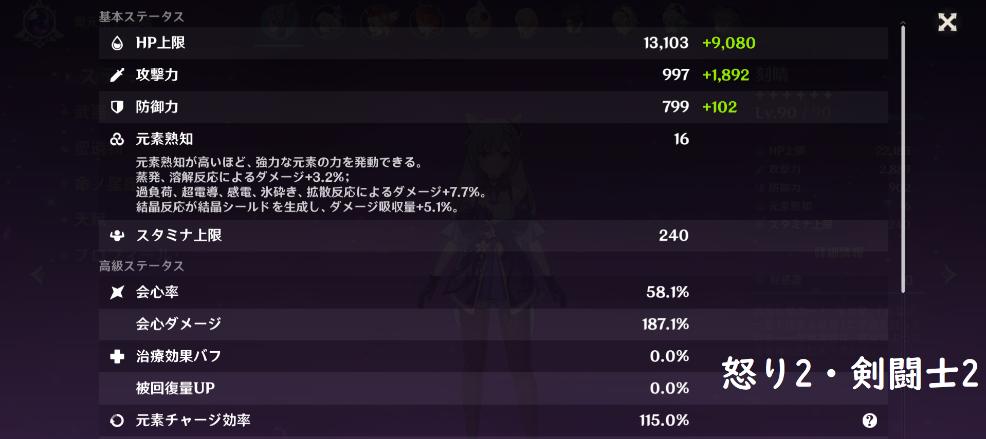怒り剣闘士型に関しては冠攻撃なのに聖遺物だけで会心率58%盛れちゃってるわ
